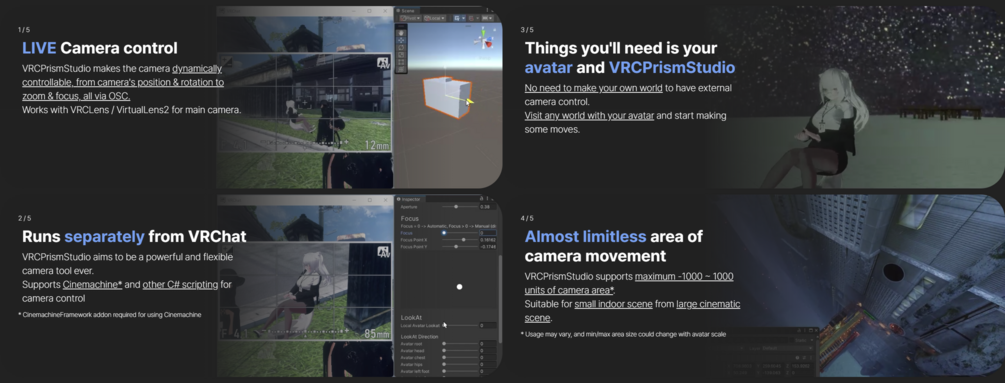 VRCPrismStudio is a framework that allows you to change the position, angle, and settings of your favorite avatar camera gimmick in real-time, allowing you to use shooting techniques that are not possible with the existing VRChat.